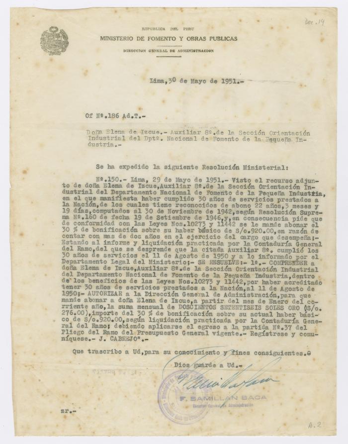 El Director General de Administración, F. Samillan Baca, por Resolución Ministerial resuelve abonar a Elena Izcue la suma mensual de S/. 276 sobre su actual haber básico por haber cumplido treinta años de servicios prestados.