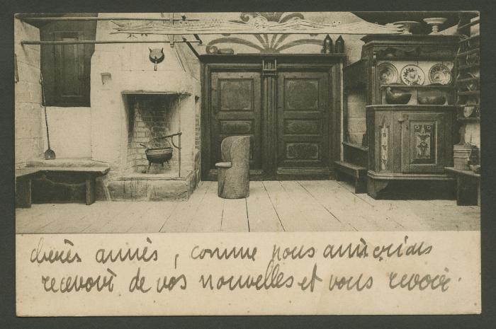 Tarjeta postal para las hermanas Izcue, les envía saludos y espera tener noticias de ellas y verlas. Portada del Museo Nórdico en Estocolmo; cocina con gran puerta al centro de la imagen; a la izquierda, una cacerola al fuego y; a la derecha, mesa y estantería con platos y cuencos.