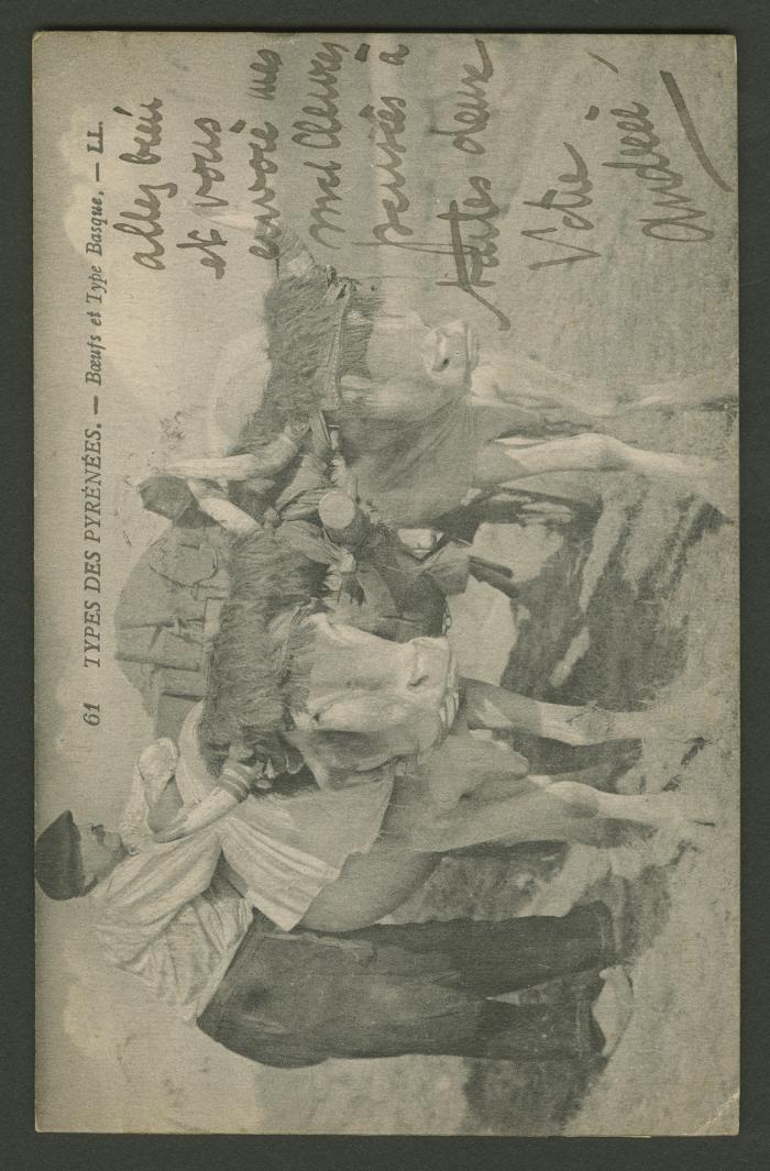 Tarjeta postal para las hermanas Izcue, nota de despedida. Portada con dos bueyes arando y un hombre vasco, de los tipos de los Pirineos.
