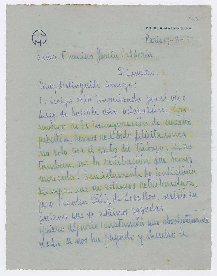 Carta de Elena Izcue dejando constancia de no haber sido pagada por su trabajo realizado en la exposición de París.