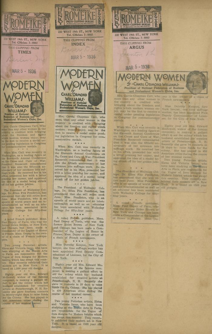 Tres recortes de periódico "Dos artistas peruanas, Elena y Victoria Izcue, quienes han estudiado en la Escuela de Bellas Artes en París, son las responsables de la moda de diseños Incas realizados en modernos textiles, de gran éxito en el país. Ellas recientemente exhiben su moderno arte en Nueva York. Basado en diseños de 1500 años de antigüedad".
