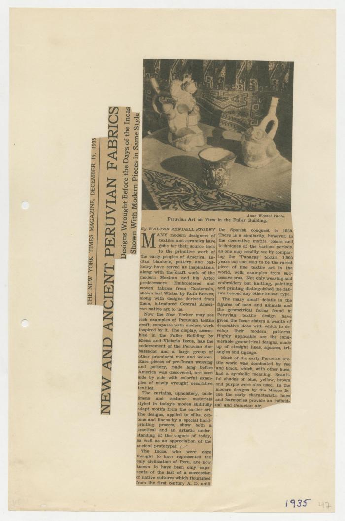 Recorte de periódico con nota de Walter Rendell Storey, contrasta los modernos diseños de las hermanas Izcue en textiles y cerámica inspirados en las culturas antiguas, en especial de un manto Paracas que sirven de inspiración al trabajo realizado por Elena y Victoria Izcue. Contiene imagen de la muestra: cerámica y textiles.