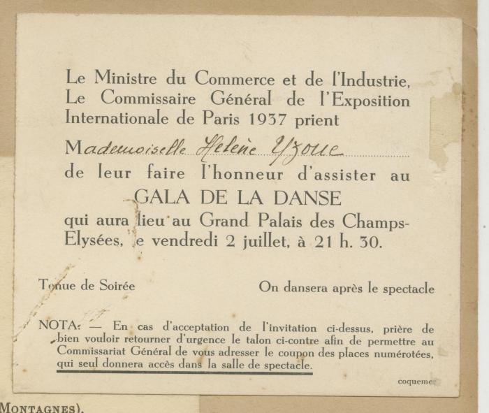 Tarjeta de invitación dirigida a Elena Izcue al baile de gala en el Grand Palais des Champs Elysées.