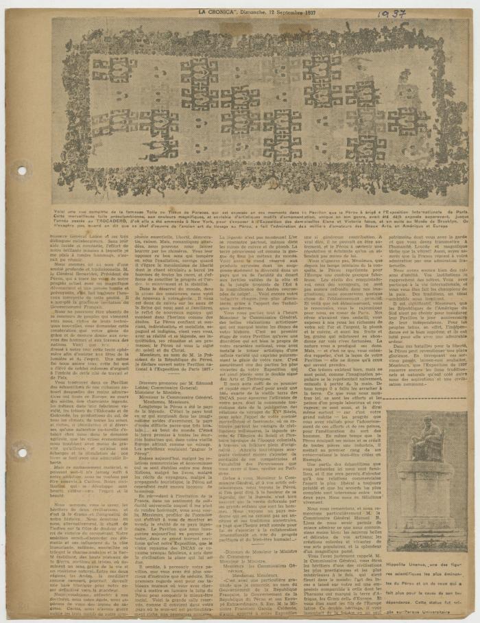 Recorte de periódico referente al Pabellón Peruano de la Exposición Internacional de París. El artículo incluye la reproducción de manto Paracas antes expuesto en Trocadero, Nueva York, Brooklyn y finalmente para formar parte del Pabellón Peruano. A pie de página se ubica reproducción del monumento a Hipólito Unanue en el Parque Universitario.