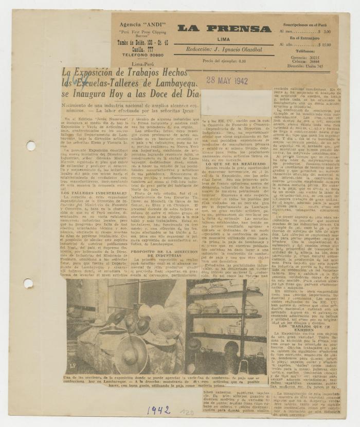 "La exposición de trabajos hechos en las Escuelas-Talleres de Lambayeque se inaugura hoy a las doce del día"