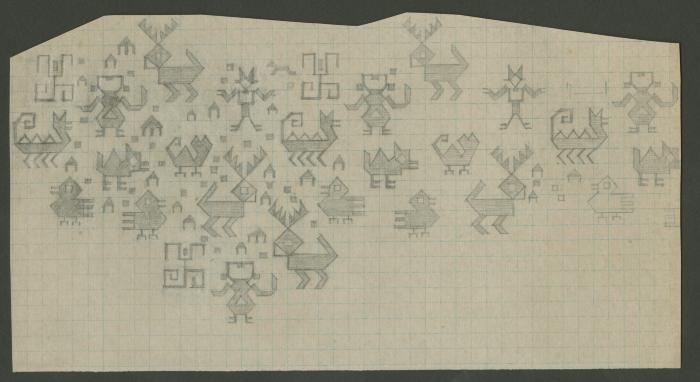 Diseño de motivos zoomorfos de aves, venados y felinos y motivos antropomorfos. Soporte: papel cuadriculado.