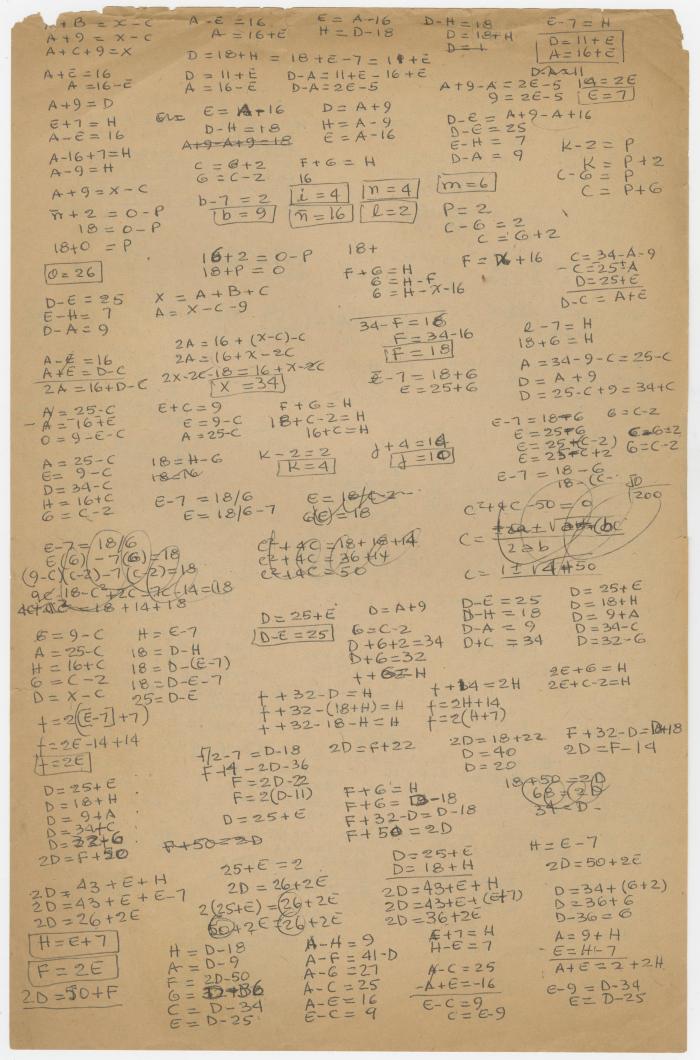 Ecuaciones en ambas caras de la hoja. Al reverso, en la parte inferior derecha, se encuentra un pequeño cuadrado con fórmulas matemáticas.
