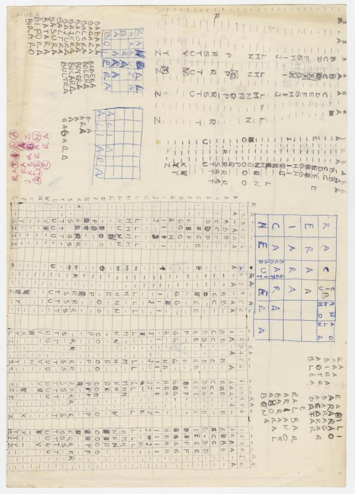 Cinco columnas con las letras del abecedario, arriba boceto de recuadro en azul, al lado izquierdo de la hoja hay una secuencia de letras bajo filas numeradas del 1 al 6, junto a dos bocetos de recuadros. Al reverso, recuadro grande con las letras "R" y "A".