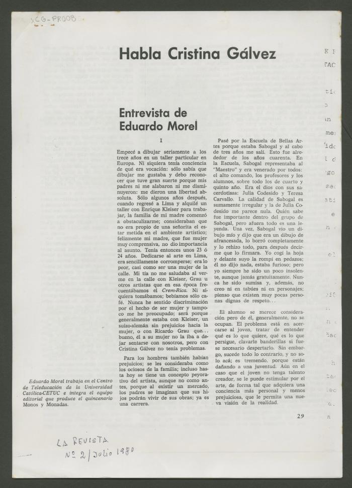 Entrevista a Cristina Gálvez realizada por Eduardo Morel. Gálvez reflexiona sobre su carrera artística, desde sus inicios en el dibujo a los trece años hasta su dedicación a la escultura. Describe la influencia de su entorno familiar y las dificultades que enfrentó como mujer en el mundo artístico de Lima en ese momento. Habla sobre su formación en la Escuela de Bellas Artes y su experiencia con el famoso pintor Sabogal.
