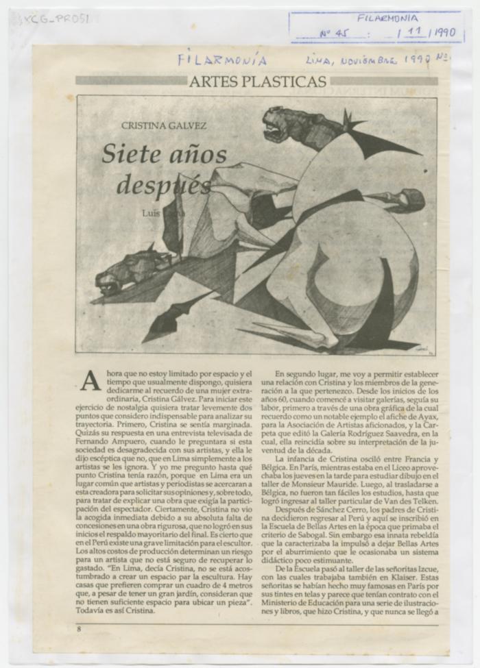 Tributo a la artista Cristina Gálvez, destacando su obra y su impacto en el mundo del arte peruano. Se mencionan aspectos de su vida, desde su formación en París y Bélgica hasta su regreso al Perú y su influencia en la escena artística limeña. Se resalta su enfoque único en el arte, su dedicación a la escultura y su lucha contra la marginalización en la sociedad artística peruana. Además, se mencionan anécdotas personales y momentos clave en su carrera, como su primera exposición y su incursión en la escultura. El texto concluye reflexionando sobre el legado perdurable de Cristina Gálvez y su impacto duradero en la imaginación colectiva.